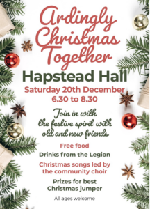 As we head into the festive season, we’re delighted to share details of a brand-new community event happening in the village this Christmas. Ardingly Christmas Together will take place on Saturday 20th December, from 6.30pm to 8.30pm at Hapstead Hall.