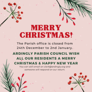 Ardingly Parish Council wish all our residents a very Happy Christmas. The office will close on the 24th of December and reopen on the 2nd of January. If you need to contact