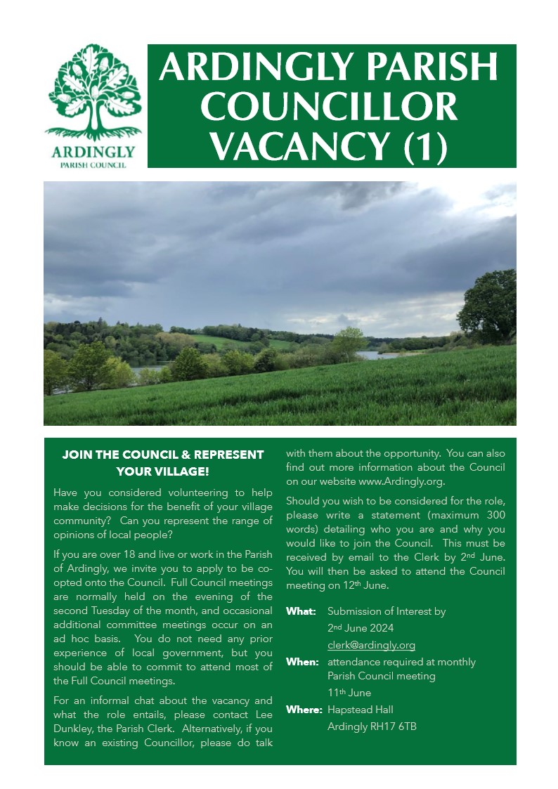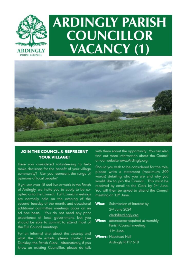 Vacancy on the Council! / General Announcements / By Tracy Cruickshank Details of how to apply to be a Parish Councillor can now be found here. Deadline 2nd June 2024.